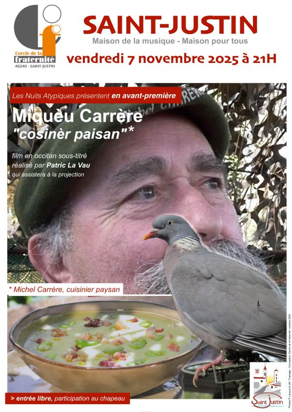 “Miquèu Carrère, cosinèr paisan” est le tout dernier film en gascon sous-titré, du documentariste Patrick Lavaud qu’il viendra présenter en avant-première à Saint-Justin où le film a été tourné entre fourneaux et appeaux. “Michel Carrère, le cuisinier paysan, sera aux côtés du réalisateur.